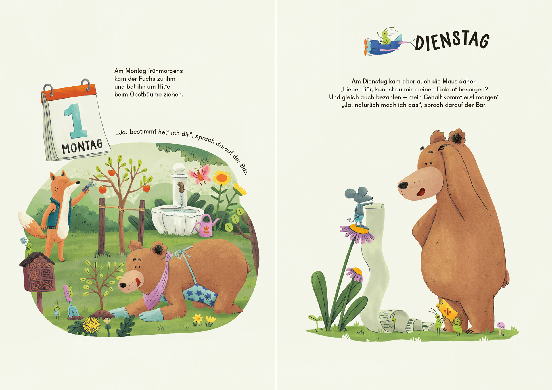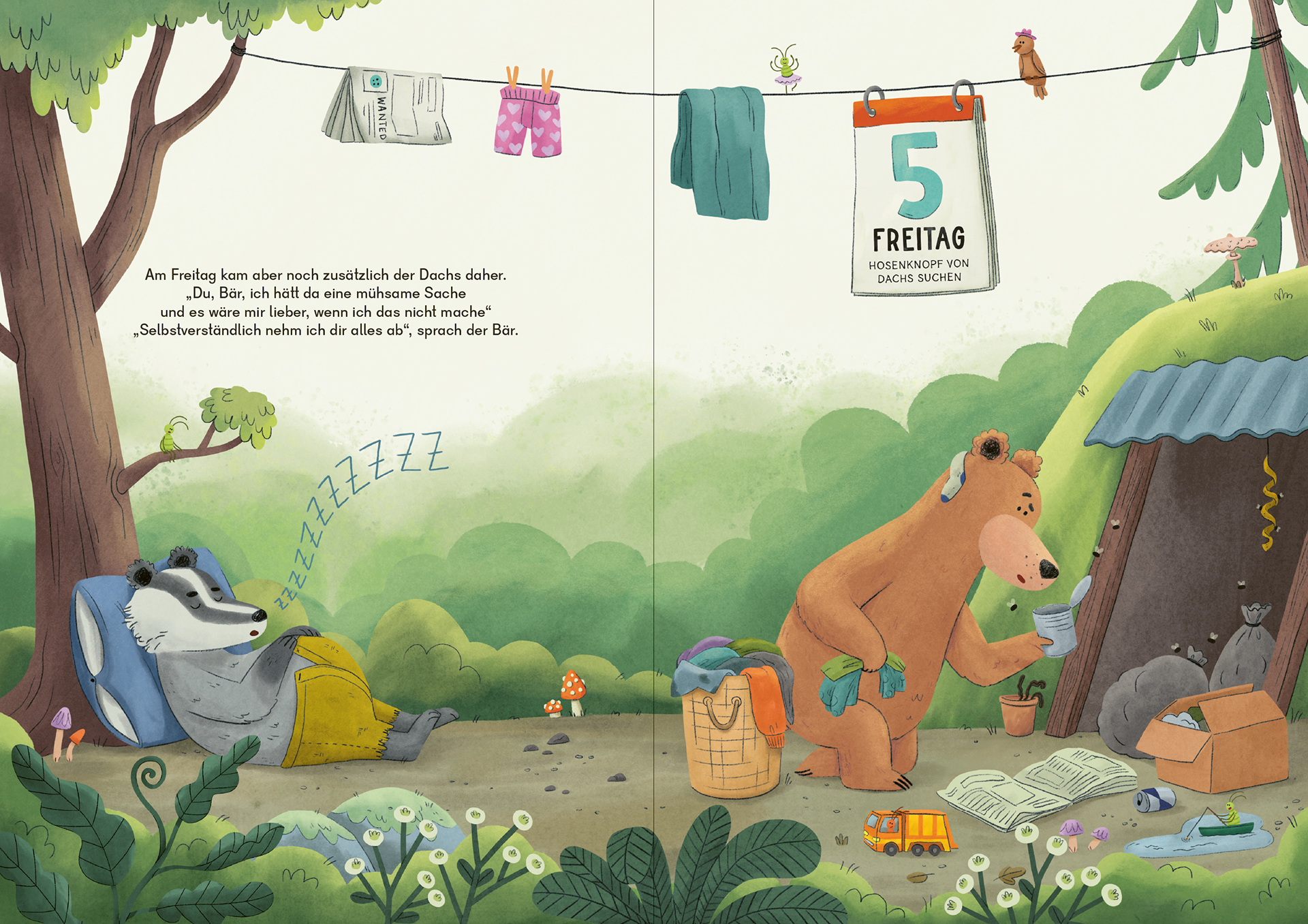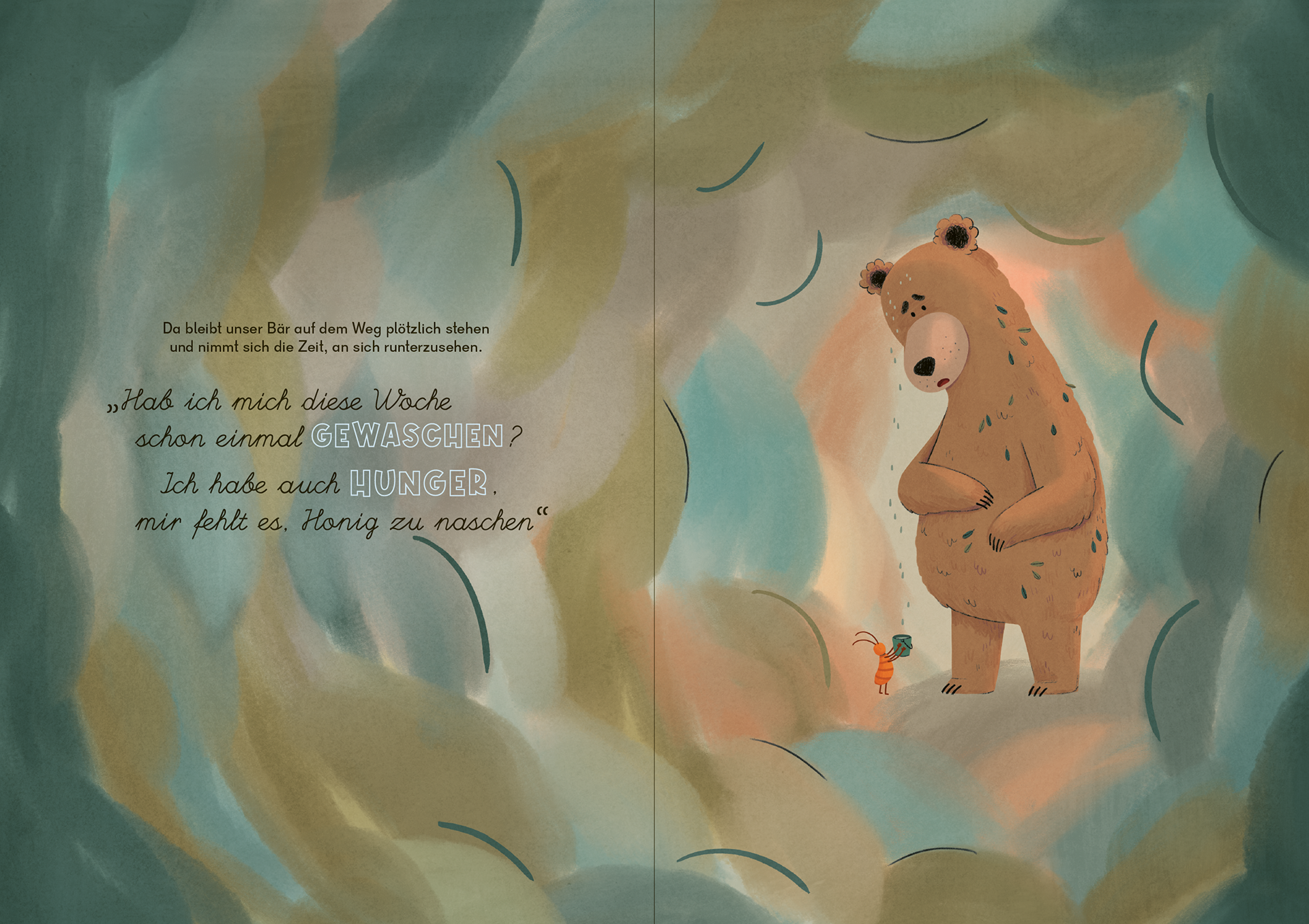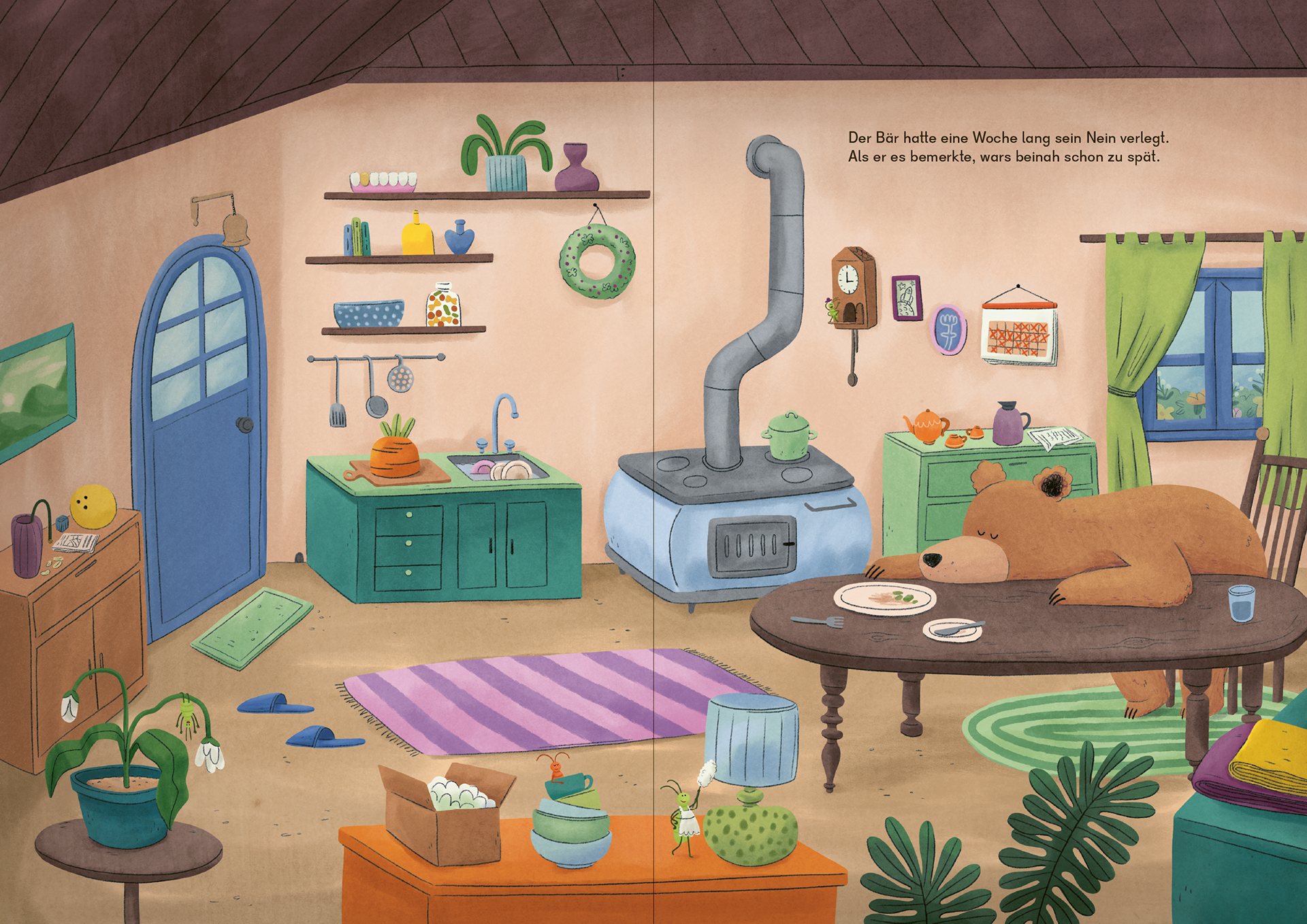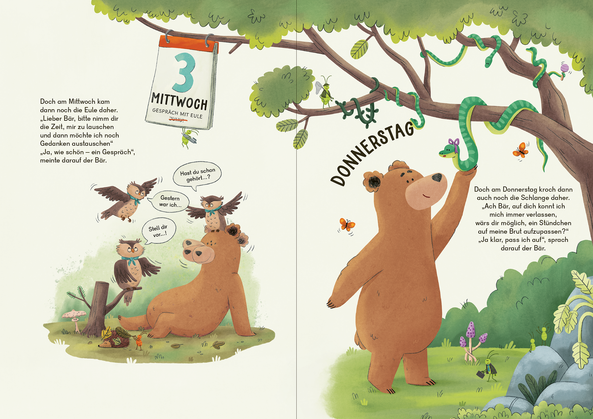 Ich habe die Illustrationen für diese charmante Geschichte gestaltet: Der Bär hat eines Tages sein „Nein“ verlegt – ausgerechnet in einer Woche, in der alle seine Hilfe brauchen. Jeden Tag bittet ein anderes Tier um Unterstützung, und unser hilfsbereiter Bär weiß nicht, wie lange das gutgehen kann. Eine Geschichte darüber, wie wichtig es ist, auch mal „Nein“ zu sagen, und wie der Bär lernt, auf sich selbst zu achten, um für alle da sein zu können.