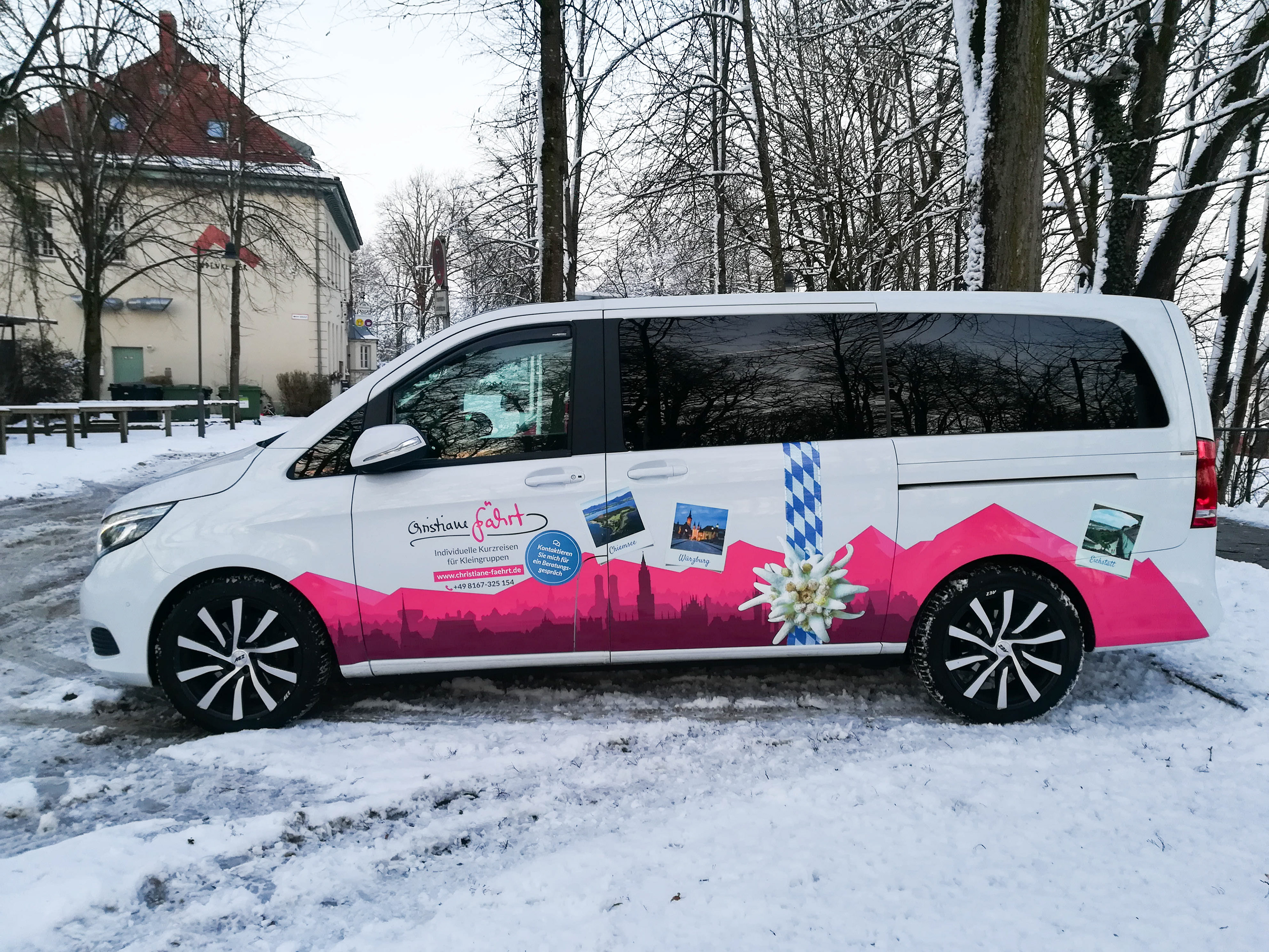 I had the pleasure to design the Mercedes-Benz V-Class of Christiane Drews. She offers individual short trips to beautiful places in Bavaria – in nature as well as to historical places.